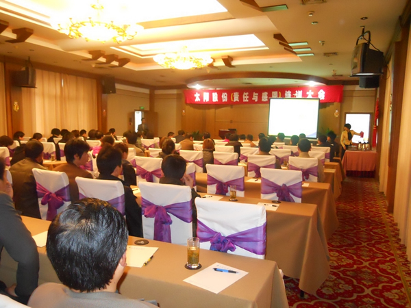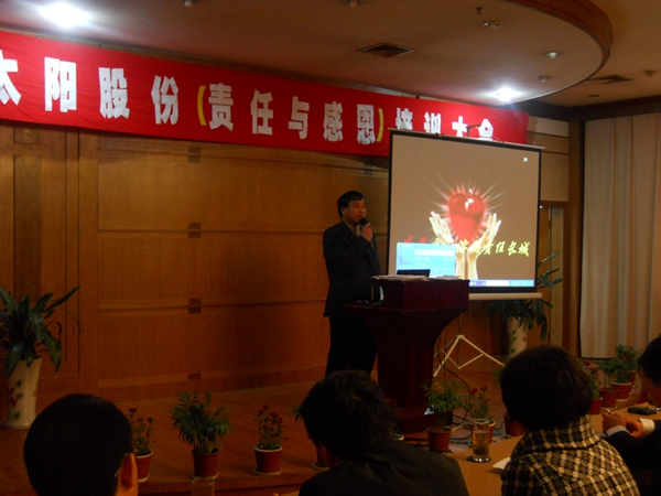 2010年4月11日,公司在上虞宾馆会议室举行了“太阳股份(责任与感恩)培训大会”。公司各部门、车间的负责人、班组长以及科室人员八十余人参加了培训会。会议由北京金蓝盟管理咨询公司的彭占利老师主持,彭老师做了精彩的主题演讲。会议结束时,公司董事长王荣庆先生做了总结发言。