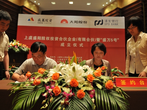 在这秋高气爽、丹桂飘香的金秋季节,我们喜迎各方宾朋,齐聚上虞国大,共祝上虞盛阳股权投资合伙企业的正式成立! 这个盛大的成立仪式由上虞市人民政府金融办公室主办,由上海盛万投资管理有限公司、浙江太阳股份有限公司及上海浦东发展银行股份有限公司绍兴上虞支行共同承办。出席仪式的有来自市组织部、发改委、财政局、科技局、工商局、工业强镇等的分管领导、有来自相关合作企业及上虞市备选上市企业的负责人、还有来自社会各界的投资人士。 会议开始,主持人介绍了与会的各位贵宾,市金融办主任朱鑫海先生的一席致辞拉开了大会帷幕。大会上,上虞市副市长吴志育先生、上海股权投资协会秘书长陈建平先生、上海浦东银行杭州分行投行部总经理刘红女士、上海盛万投资有限公司董事长严爱娥女士、浙江太阳股份有限公司董事长王荣庆先生分别做了精彩的致辞。 陈建平先生在致辞中感谢上虞市政府对于股权投资的积极支持,希望上虞市尽早成立起股权投资协会,共同促进长三角资本市场的活跃发展。陈先生说,此次来上虞寻求合作的上海盛万投资管理有限公司,其旗下的盛万基金拥有一个精研资本运作、眼光独到的优秀团队;太阳股份有限公司是一家销售有规模、产品有技术含量的制造型企业。他对上虞盛阳股权投资合伙企业的成立寄予了殷切期望。严爱娥女士对盛万投资公司做了介绍,盛万投资公司旗下正在运作的项目有18个,握有的资金达16亿,对盛阳股权投资合伙企业的发展充满信心。王荣庆先生对浙江太阳股份有限公司的历史和现状做了介绍,此次成立股权投资合伙企业,正是在新时期新形势下,积极开拓公司新的增长点,走出传统产业束缚,投身资本市场,加快转型升级,确保企业稳定健康发展的必由之路。我们从盛万投资的优秀业绩中看到了他们团队优秀的专业质素,同时,我们也相信,在上虞市委、市政府相关部门和领导的大力支持和关心爱护下,通过太阳股份和上海盛万的友好合作,我们上虞盛阳股权投资基金一定会给我市的金融资本领域注入新的强大的活力,会树起一个新的标杆、新的典范!