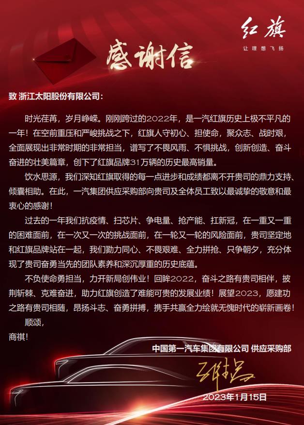 | 来自中国第一汽车集团有限公司的感谢信 |